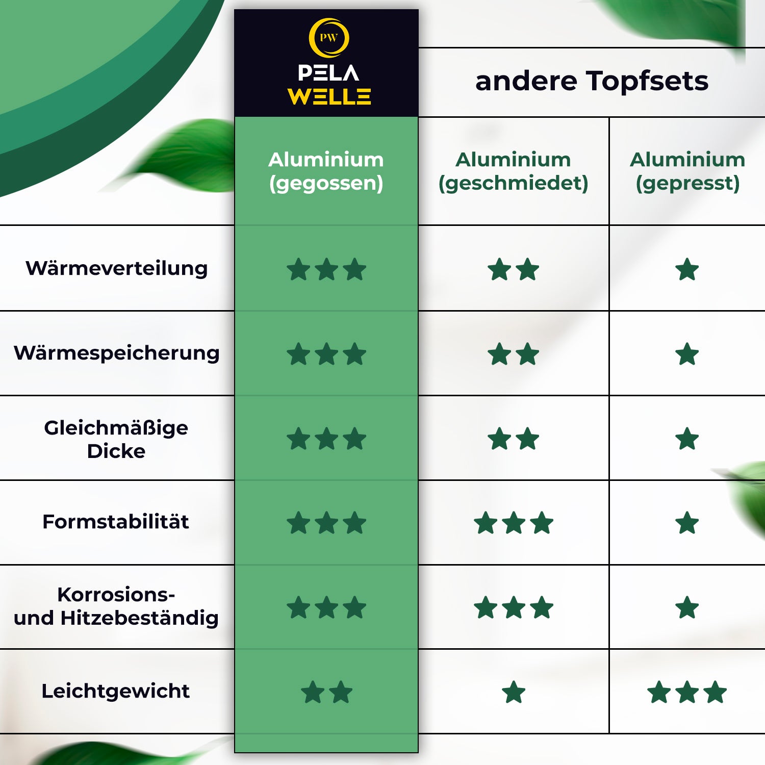 Unser Topfset ermöglicht ein schnelles Erwärmen und gewährleistet eine gleichmäßige und optimale Verteilung der Wärme.
